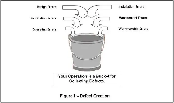 Figures 1 highlights where most failure casing defects and errors come from and explains that eventually you will have so many problems in your operation that your bucket overflows and you drown in strife! I first came across this defect creation model at a seminar delivered by a DuPont Chemicals manager touring Australia in the early 2,000’s.